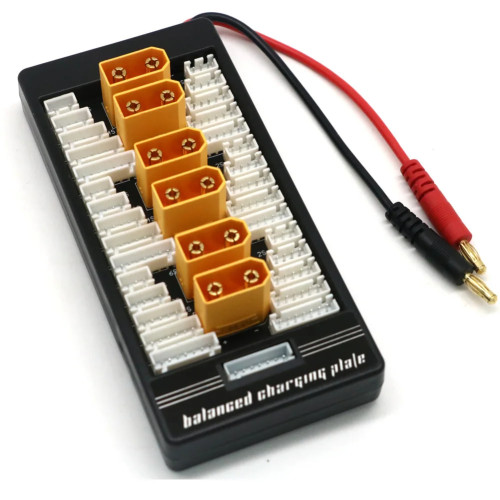 Плата паралельної зарядки призначена для одночасного заряджання до шести LiPo або Liion акумуляторів з роз'ємом XT90. Підключається до штатного розьему зарядного пристрою з основним розʼємом типу "банан" та балансувальним. Плата обʼєднує ємності підключених акумуляторів і дозволяє заряджати іх більшим струмом, як один великий акумулятор.